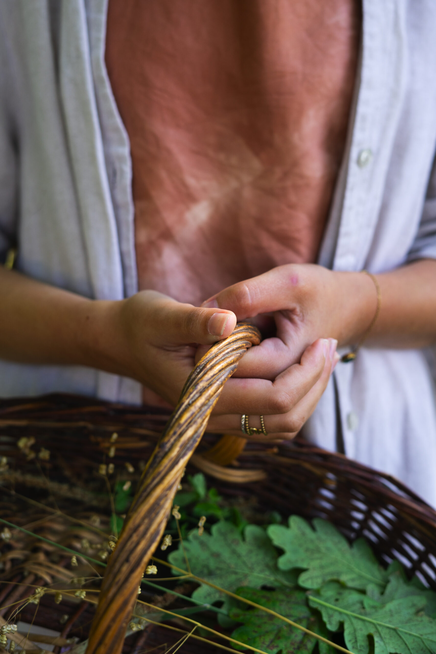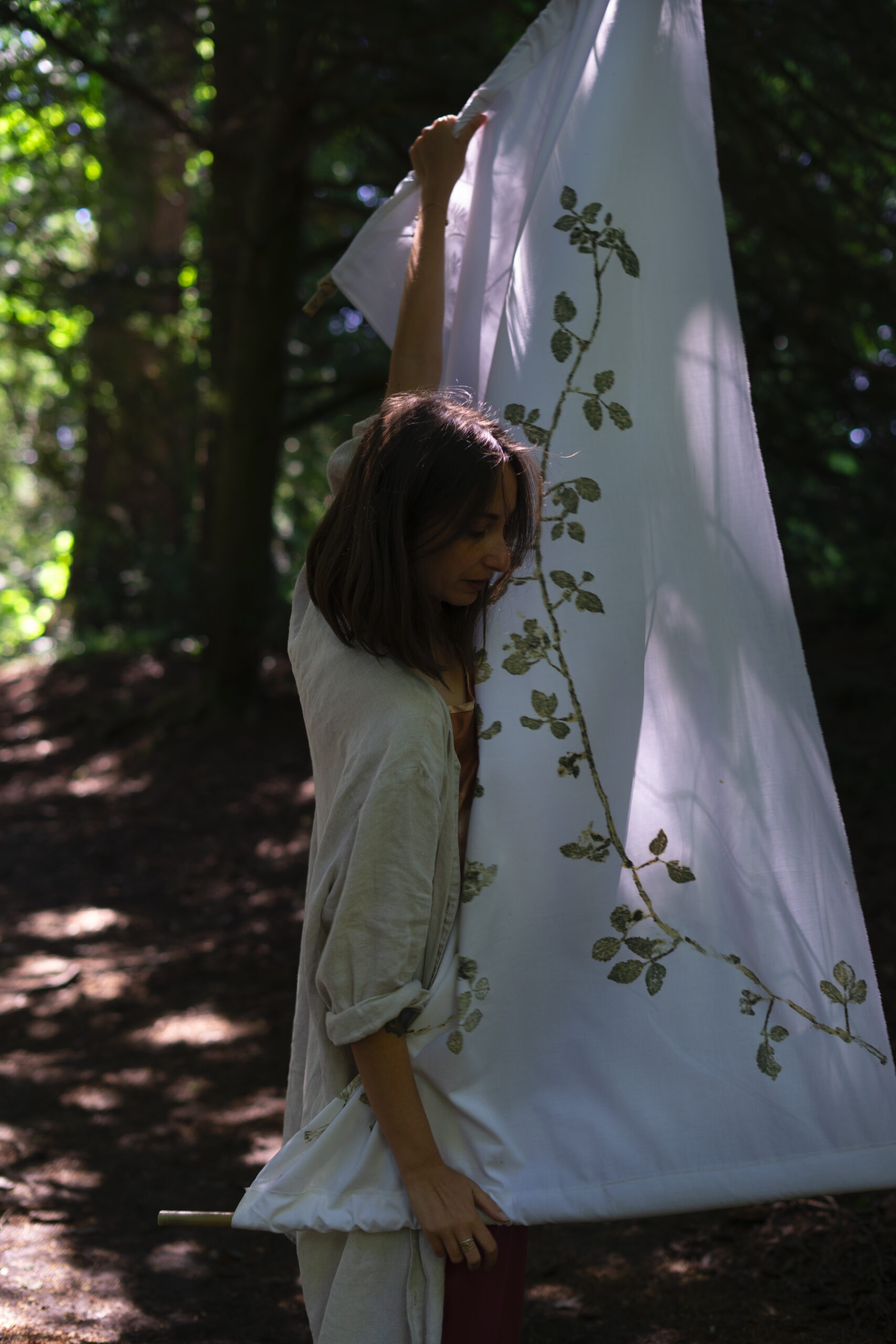 De la cueillette honorable à la teinture végétale, chaque geste se fait en conscience. Je chine mes tissus, j’allume mes marmites, je redépose les végétaux à la Terre. Telle une alchimiste, je co-crée avec les plantes que je rencontre au gré de mes déambulations forestières. Chaque création devient donc le témoin d’une rencontre sacrée. Ces plantes que l’on trouve au bord des chemins, que l’on ignore souvent et qui ont pourtant tant à partager. Apprendre à les reconnaitre, à leur accorder une place particulière à mes côtés est une façon pour moi de les honorer.