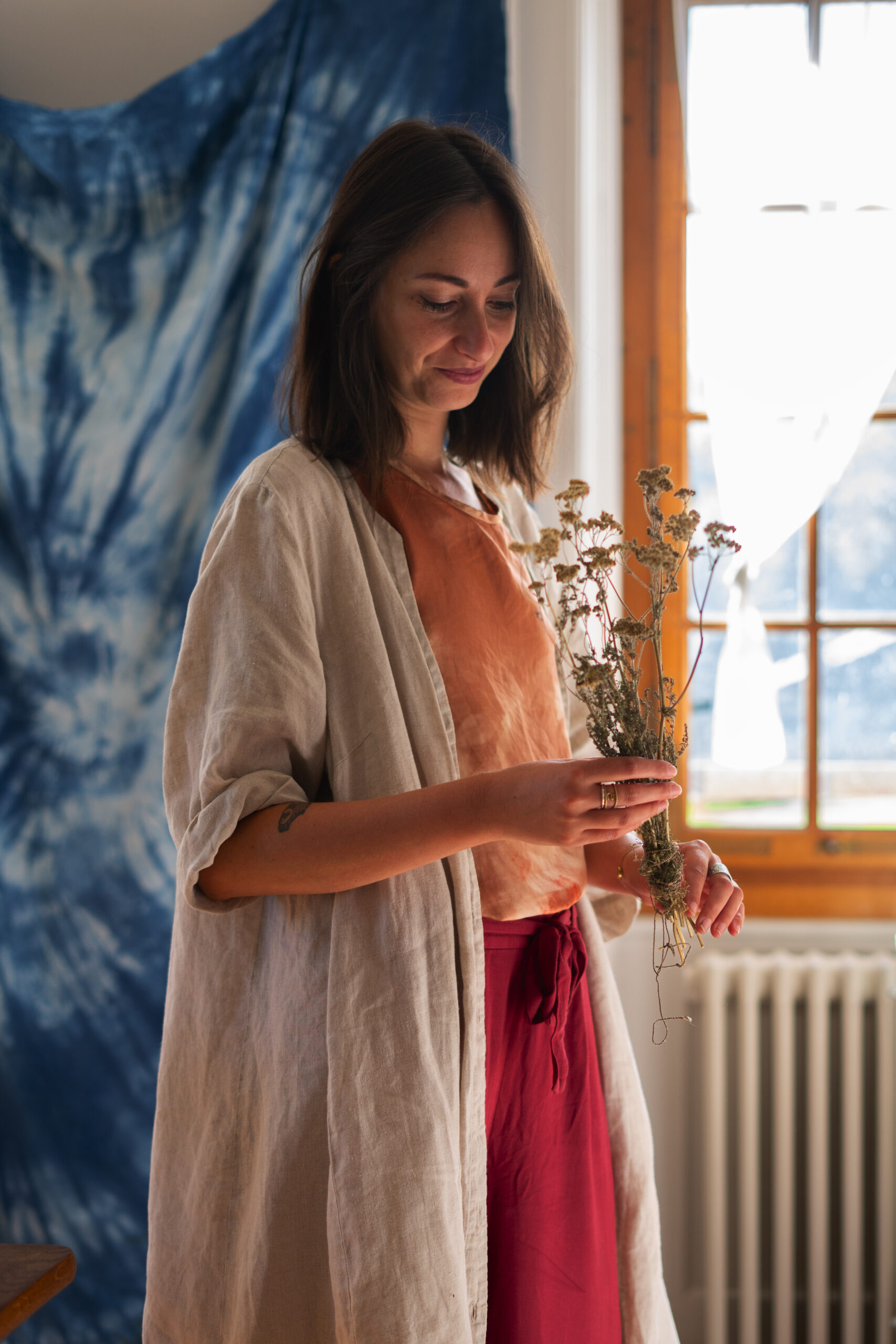 De la cueillette honorable à la teinture végétale, chaque geste se fait en conscience. Je chine mes tissus, j’allume mes marmites, je redépose les végétaux à la Terre. Telle une alchimiste, je co-crée avec les plantes que je rencontre au gré de mes déambulations forestières. Chaque création devient donc le témoin d’une rencontre sacrée. Ces plantes que l’on trouve au bord des chemins, que l’on ignore souvent et qui ont pourtant tant à partager. Apprendre à les reconnaitre, à leur accorder une place particulière à mes côtés est une façon pour moi de les honorer.